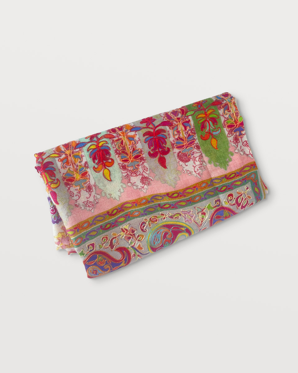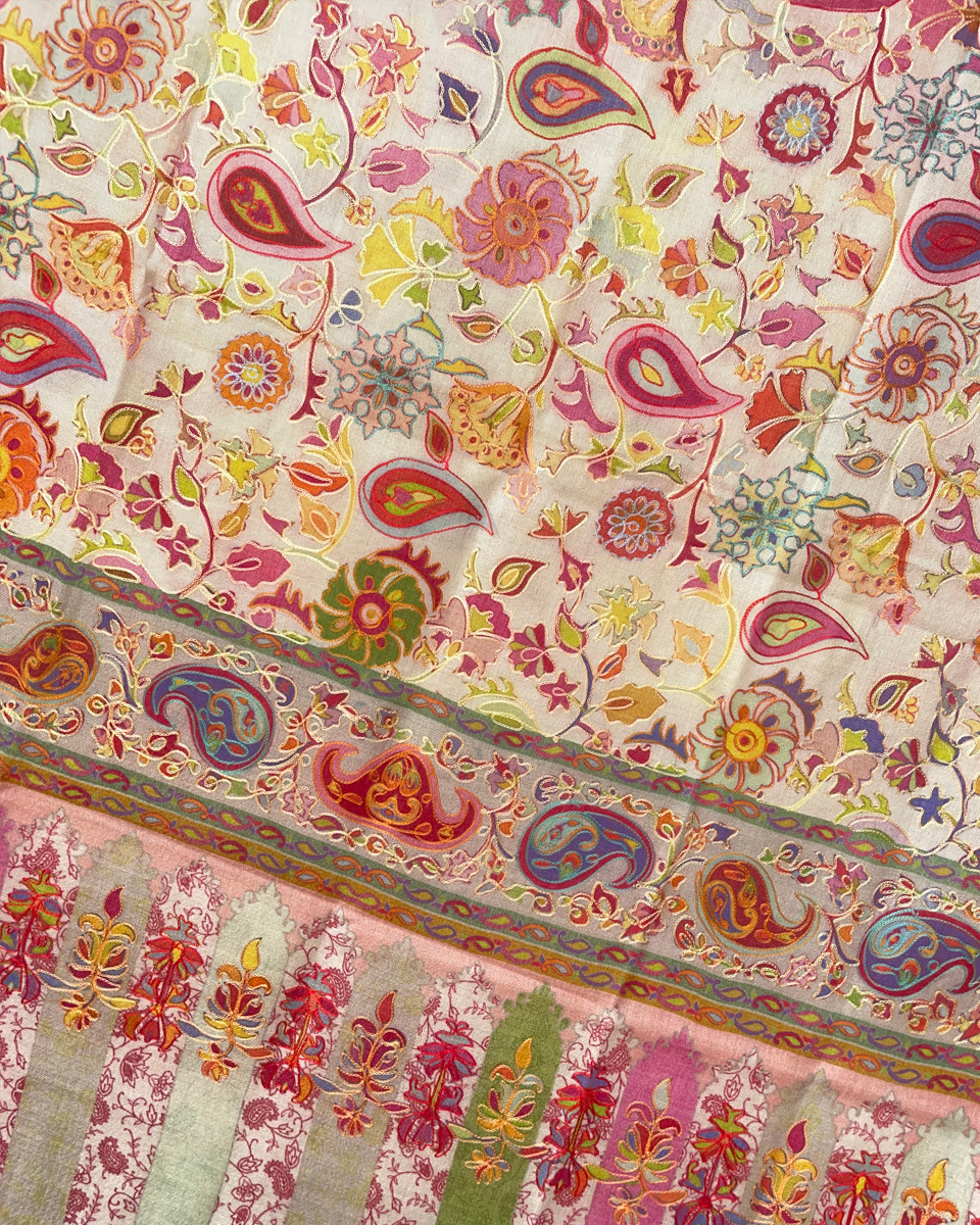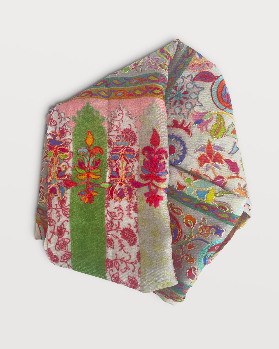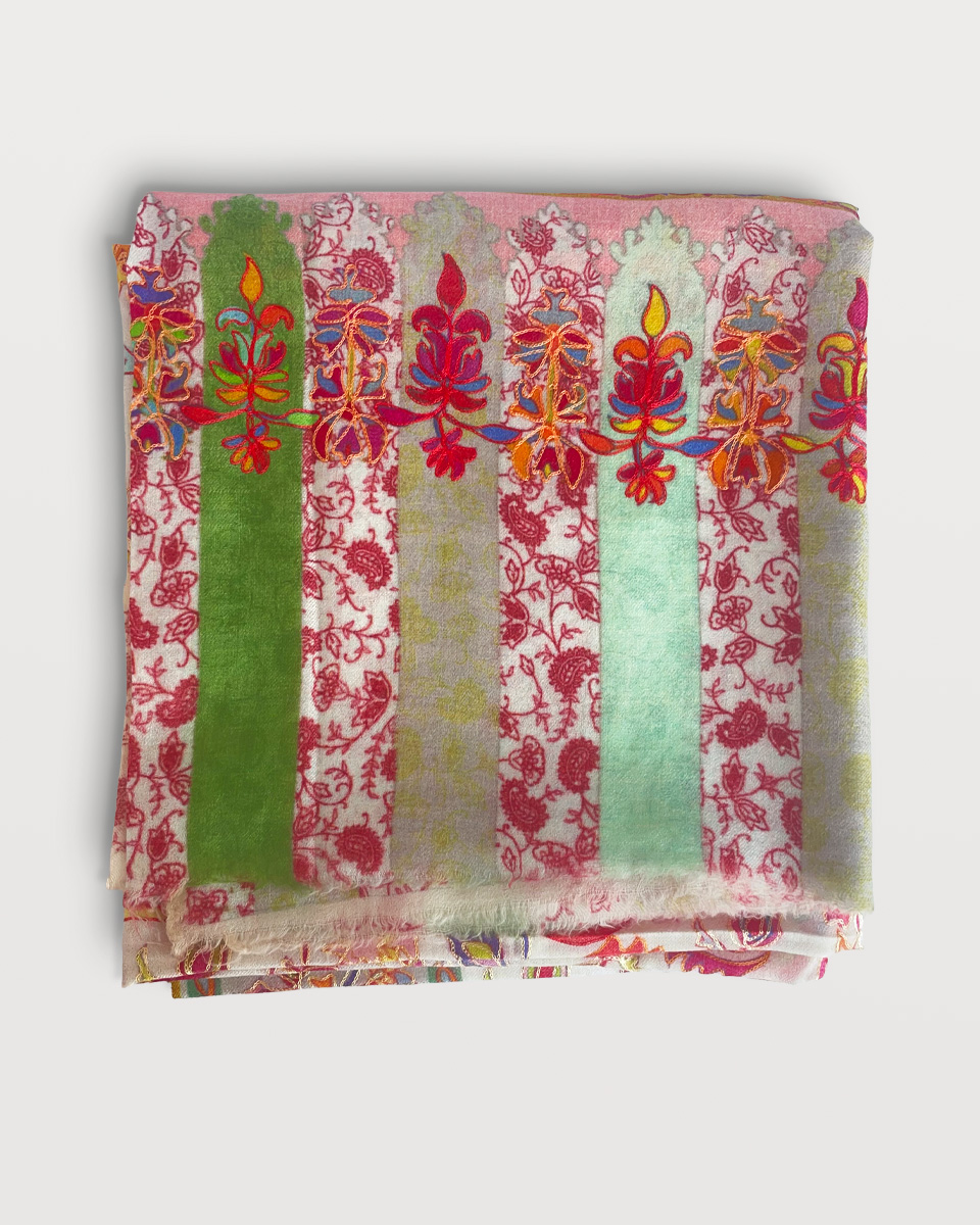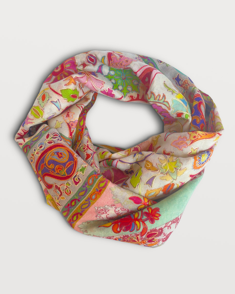 Frühlingstraum ist ein federleichter Schal, der zarte Eleganz mit kunstvoller Handarbeit vereint. Auf einer Basis aus sanftem Cremeweiß entfalten sich fein gedruckte Blumen, Ornamente und verspielte Formen in lebendigen Farben: wie ein lichtvolles Aquarell. Umrahmt werden die zarten Blumendrucke von feinen goldenen Nähten und Säumen, die dem Schal einen edlen Hauch verleihen.